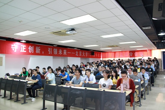接下来,由郝平书记主持致辞,随后全场师生起立,共唱国歌。京南的燕园里,虽只是偏隅一角,却在暖暖的3302教室,老师和同学们齐刷刷起立,跟京北燕园一起齐唱国歌。国歌的曲调仿佛穿透云层,尾随阳光,浸入风光,南北燕园遥相呼应,一南一北,共同祝福北大的百二十生日。